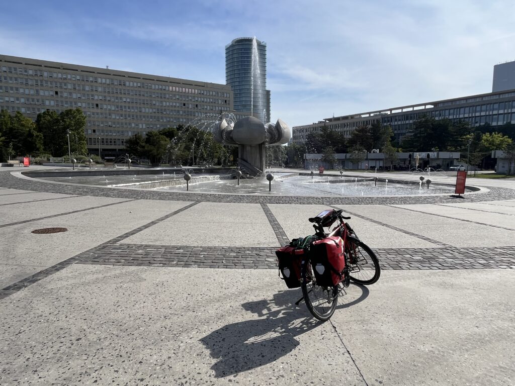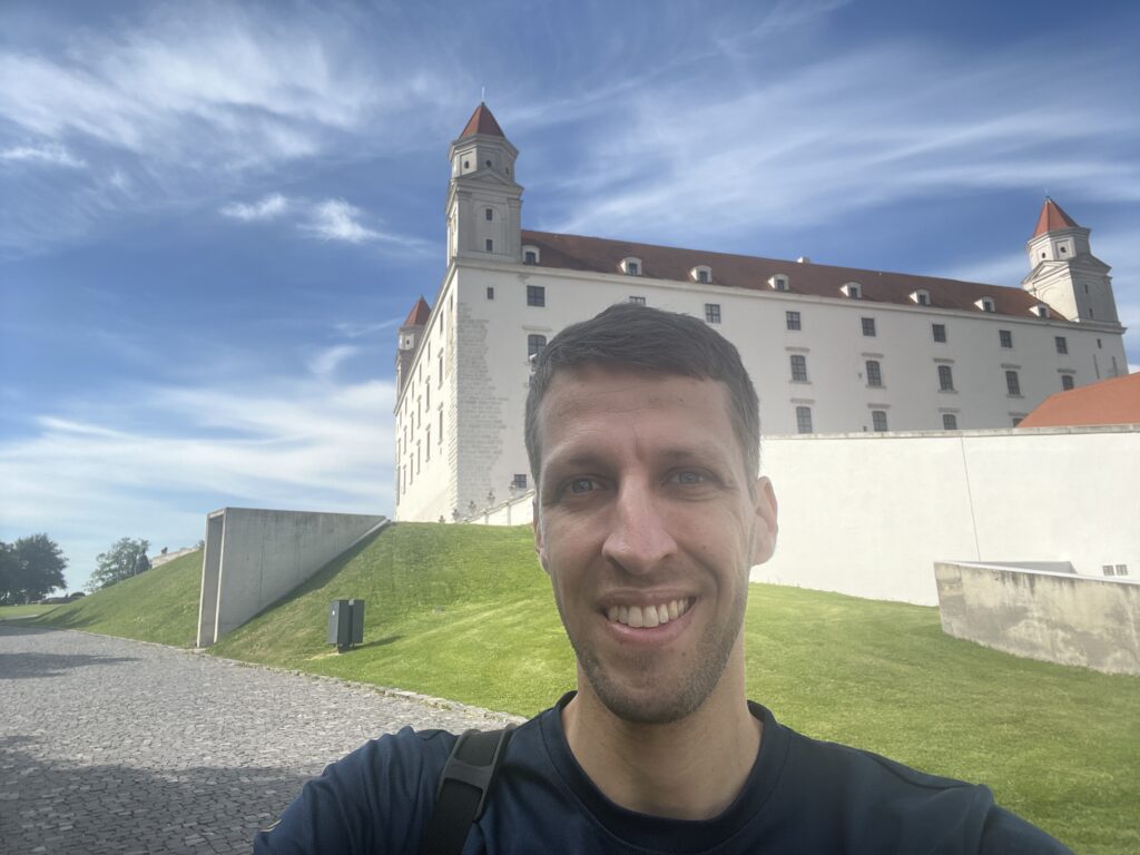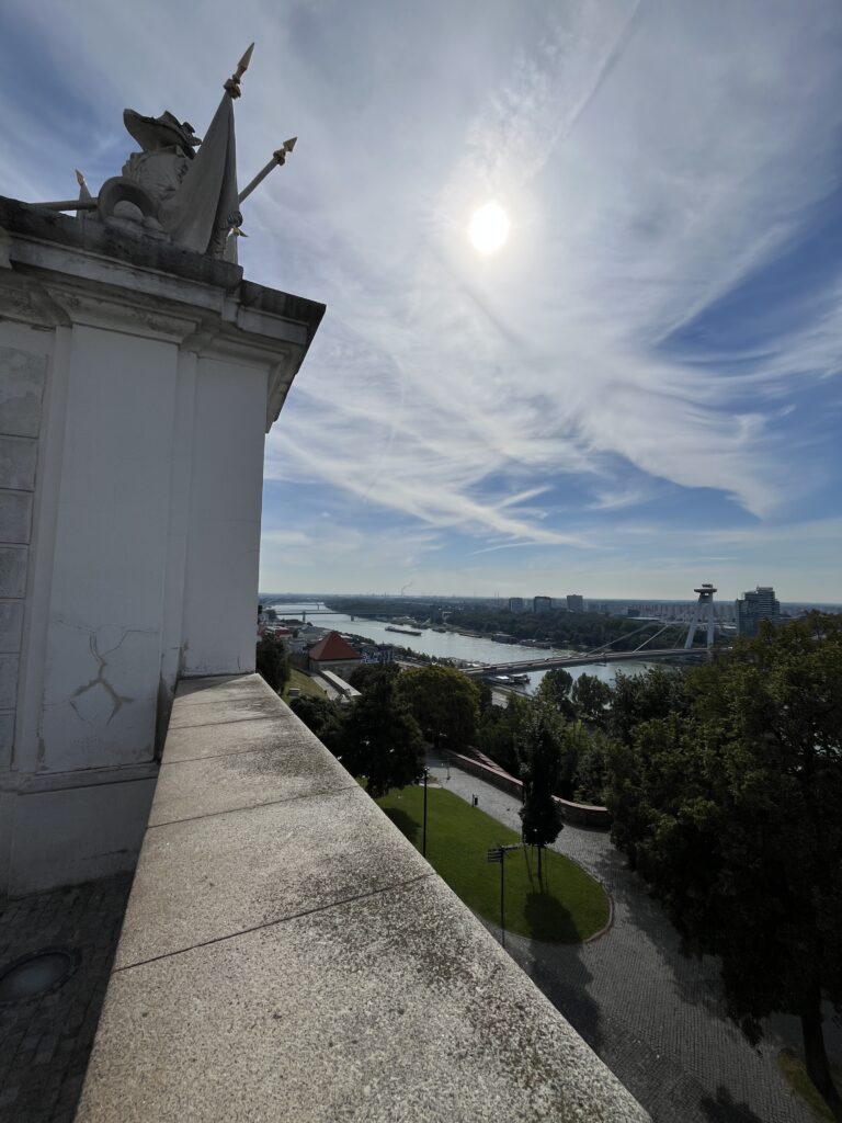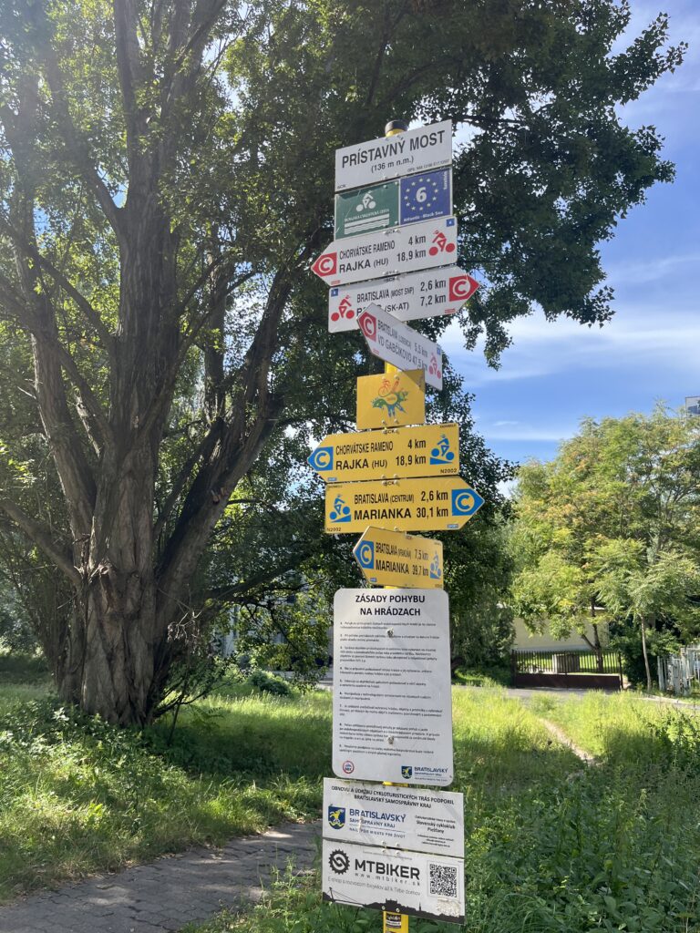At 7:15 I woke up, stayed still a bit in the bed and then ate breakfast in the hotel. The buffet was great. After check-out, I went to a fountain (Námestie slobody) and then visited the castle. At 10 o‘clock, I reached the EuroVelo 6 route, which I will follow to the Black Sea.